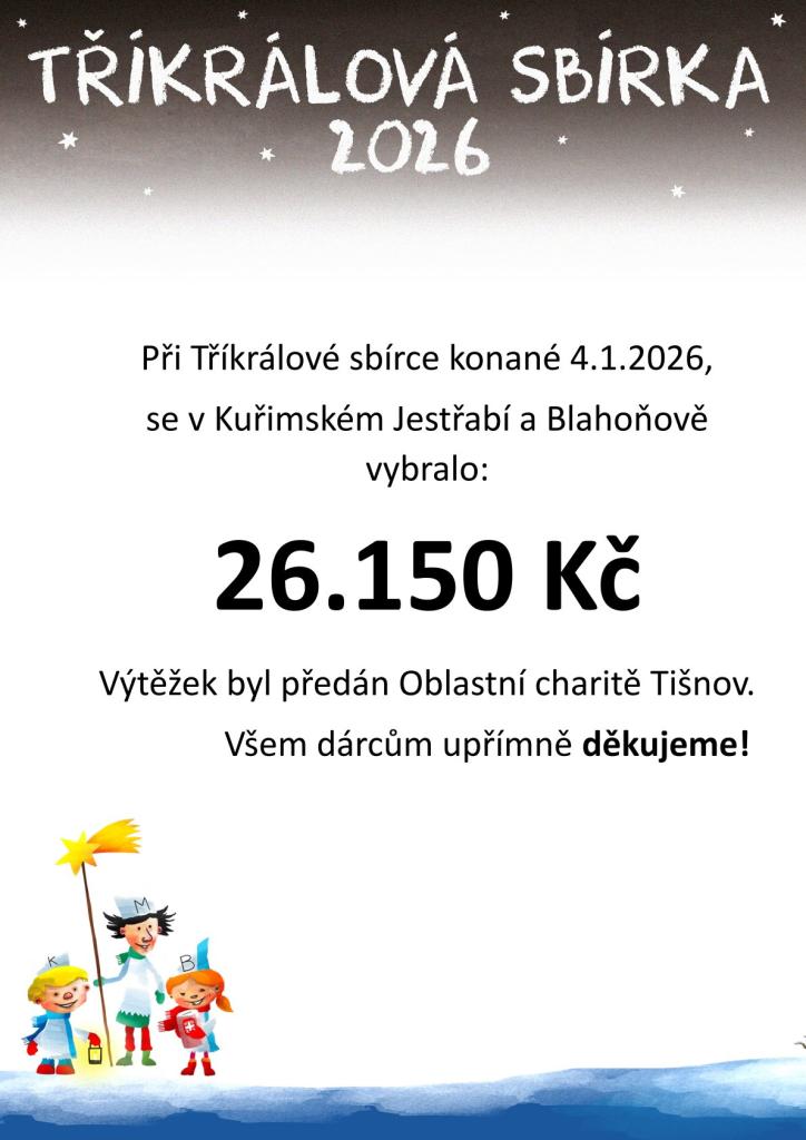 Dne 4. ledna 2026 proběhla v Kuřimském Jestřabí a Blahoňově Tříkrálová sbírka. Celkový výtěžek činil 26.150 Kč, který byl předán Oblastní charitě Tišnov. Tato akce je každoroční tradicí, která přináší pomoc těm, kteří ji nejvíce potřebují. Všem dárcům srdečně děkujeme za jejich štědrost a podporu, ze které máme nesmírnou radost a vážíme si jí.